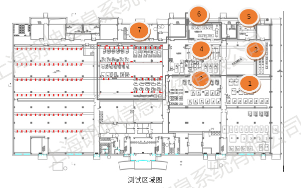 測試過程:測試區(qū)域圖如上圖所示,我們將測試現(xiàn)場主要分為6個房間,按順序給每個房間進行了編號如圖中標注,