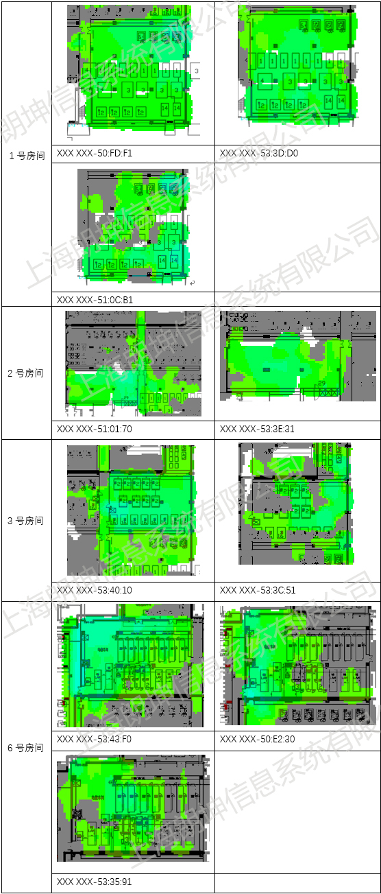 從上圖中可以發(fā)現(xiàn)1,2,3,6房間里的AP,信號強度都比較高,3號房間的XXX XXX-53:40:10這個AP甚至能覆蓋到1號房間,2號房間的XXX XXX-51:01:70這個AP信號強度把走廊里也覆蓋掉一部分,建議減小這2個AP的功率,其他幾個房間看可以選擇性的稍微降低其中某個AP的功率。