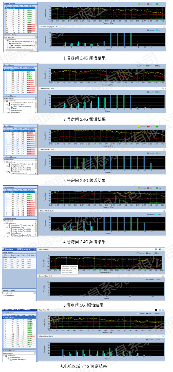 通過對每個房間的頻譜檢測,發(fā)現(xiàn)現(xiàn)場2.4G環(huán)境中存在大量的非WIFI的干擾,且存在時間比較平凡,所占信道資源也比較嚴重。其中主要的干擾源類型為MotionDetector(運動檢測器)、Microwave Oven(微波爐)、Analog Cordless Phone(模擬無繩電話),由于現(xiàn)場設(shè)備比較多,比較難以判斷具體干擾源是哪些設(shè)備產(chǎn)生的。