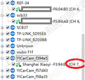 在7號房間里所說的帶有攝像頭的設(shè)備,經(jīng)過分析發(fā)現(xiàn)那些攝像頭都屬于WiFi信號,有自己的SSID,都是xiaoyi的攝像頭,且這些設(shè)備的信道規(guī)劃也不合理,有些在7信道上。如下圖